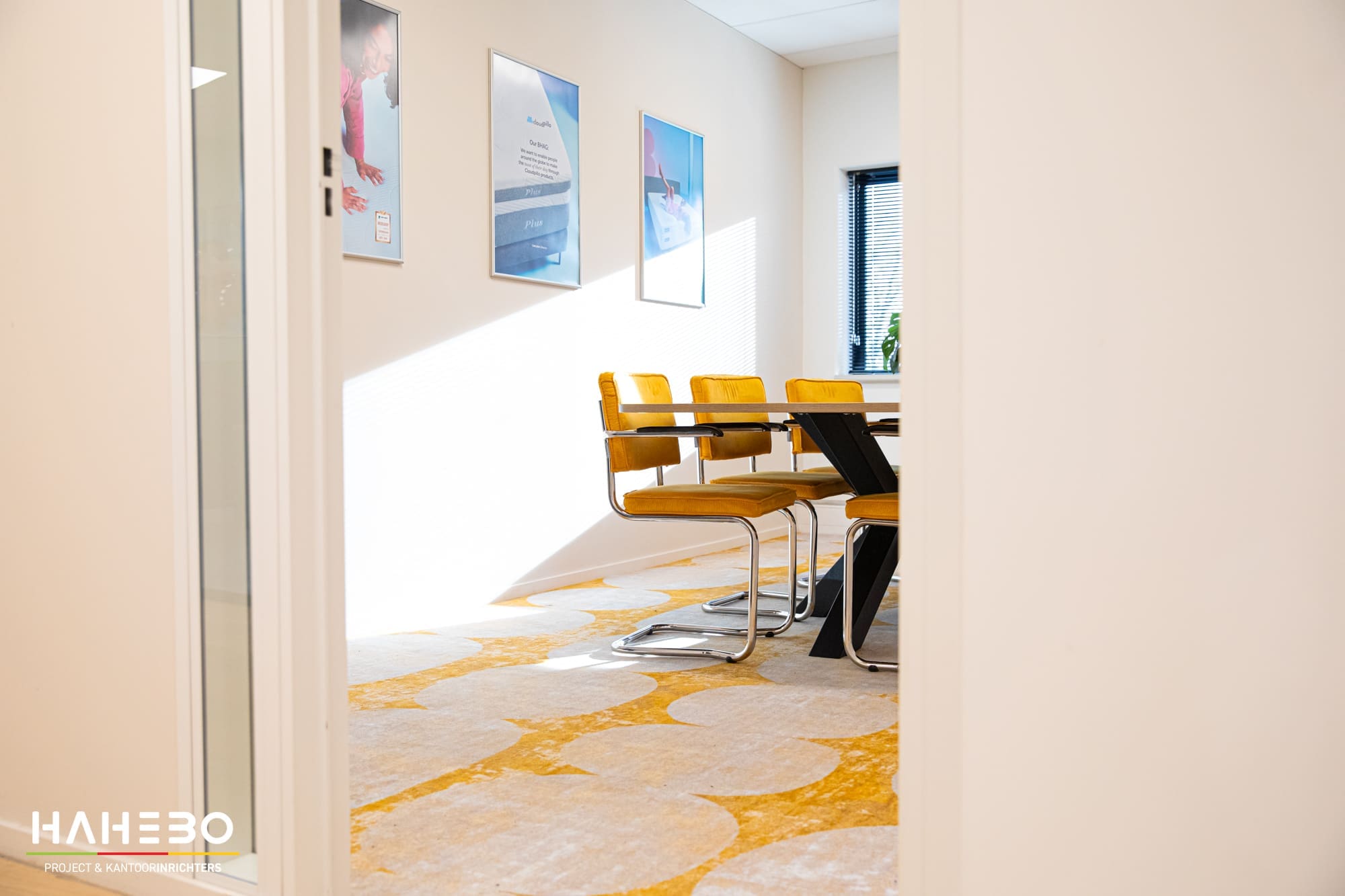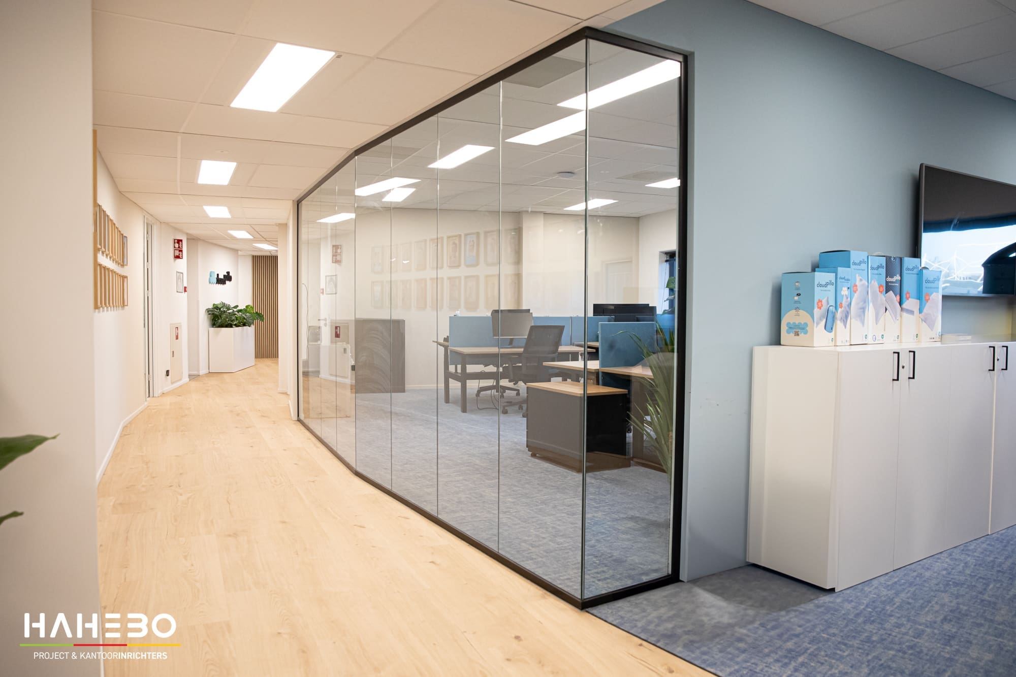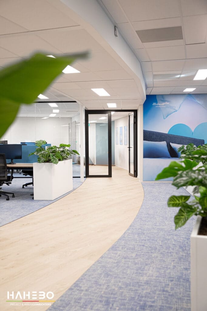 De ruimte is ontworpen met veel daglicht en open zichtlijnen. Glaswanden en een heldere routing zorgen voor een transparant karakter, terwijl de werkplekken overzicht en focus behouden. In de inrichting is de huisstijl consequent doorgevoerd: een rustige basis met lichte materialen, waarbij de frisse kleuren van Cloudpillo subtiel terugkomen in het totaalbeeld.