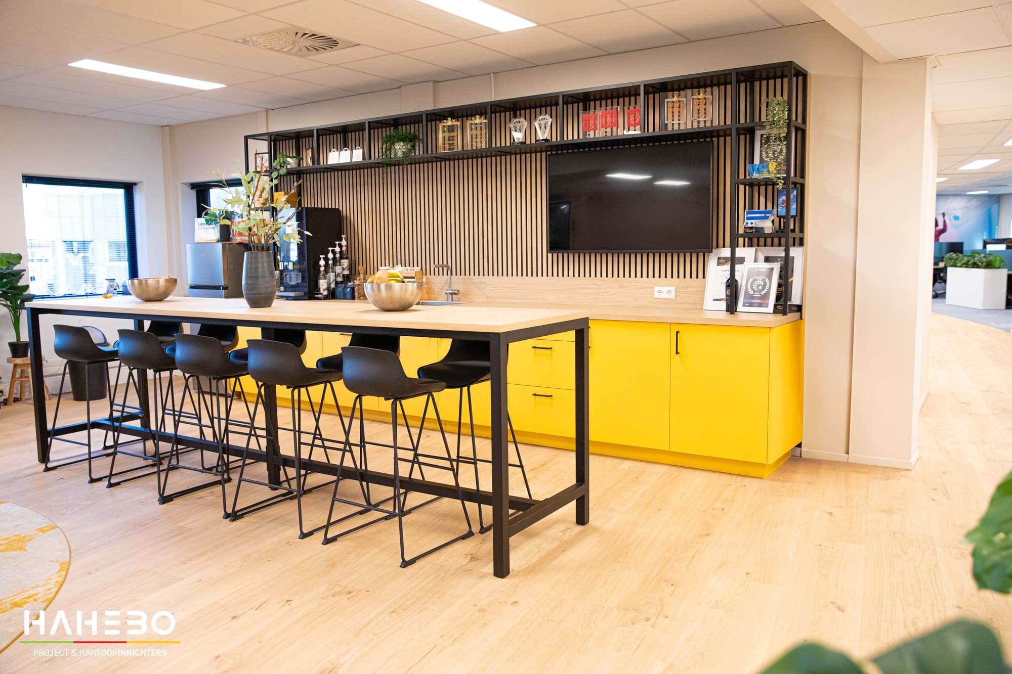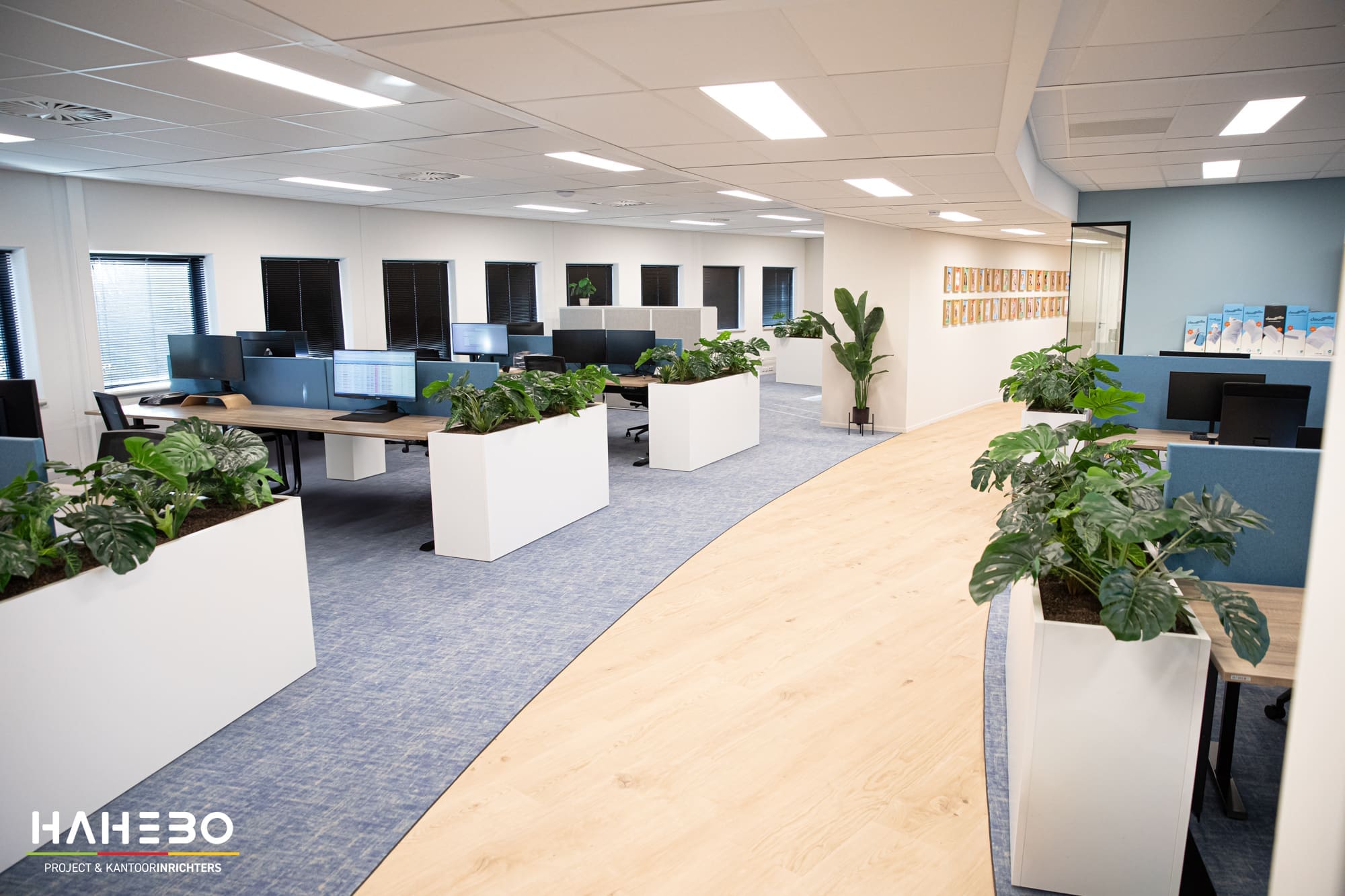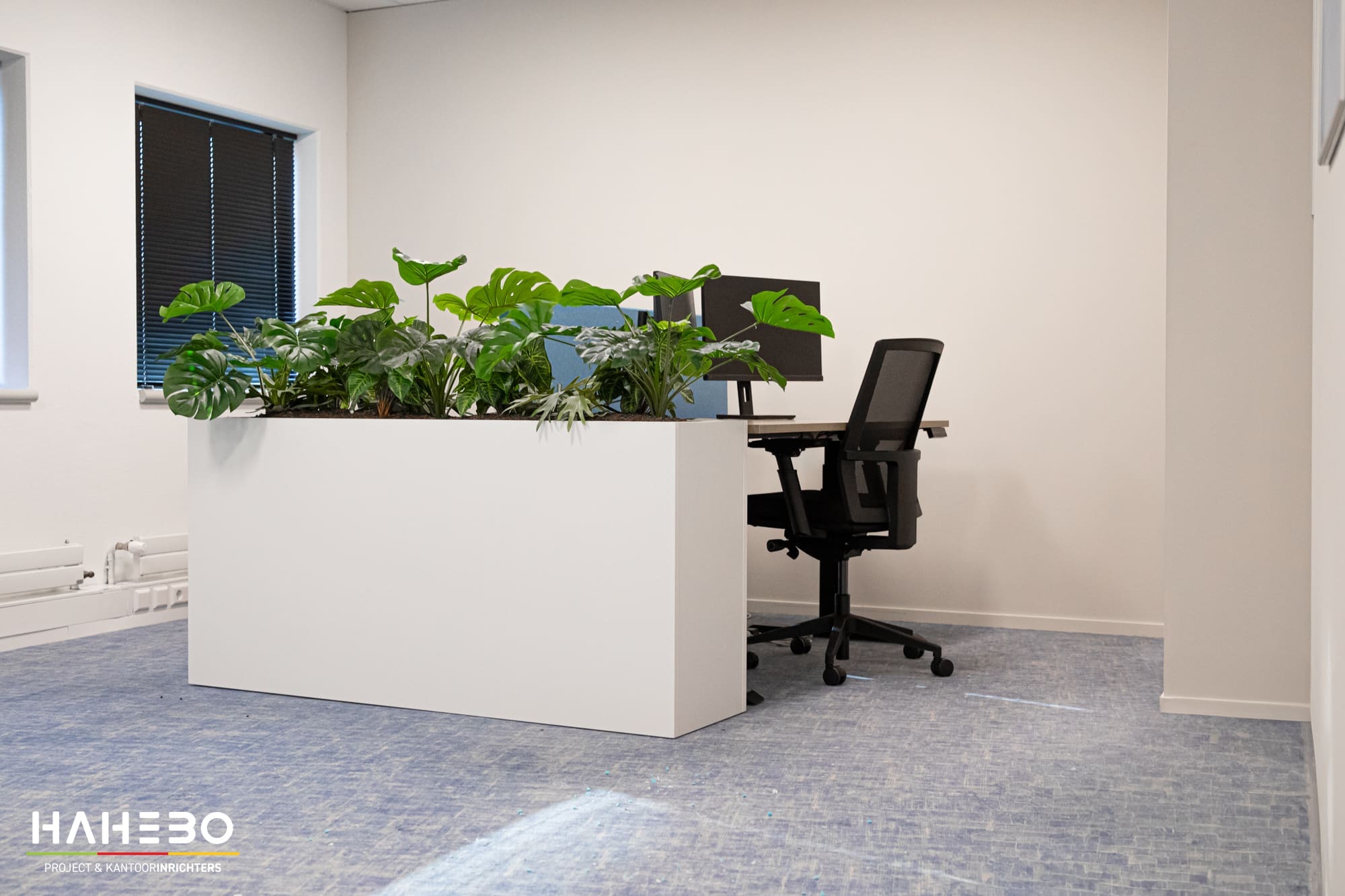 Groen speelt een zichtbare rol in het geheel. Grote plantenbakken brengen sfeer en zachtheid in de open kantoorruimte en dragen bij aan een prettige, natuurlijke beleving. De vergaderruimte is ingericht als een comfortabele setting voor overleg, in dezelfde heldere stijl. De kantine vormt het centrale ontmoetingspunt: een uitnodigende plek voor informele momenten, met een pantry-opstelling en hoge tafel die aansluiten op het dagelijkse gebruik.