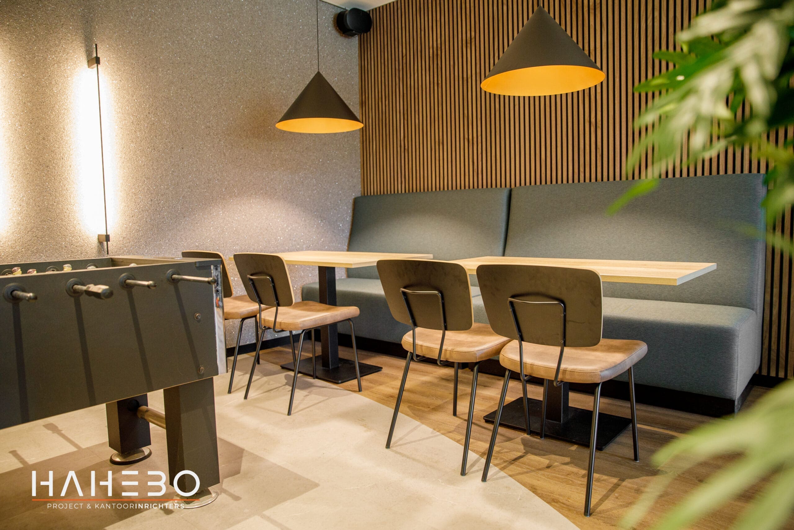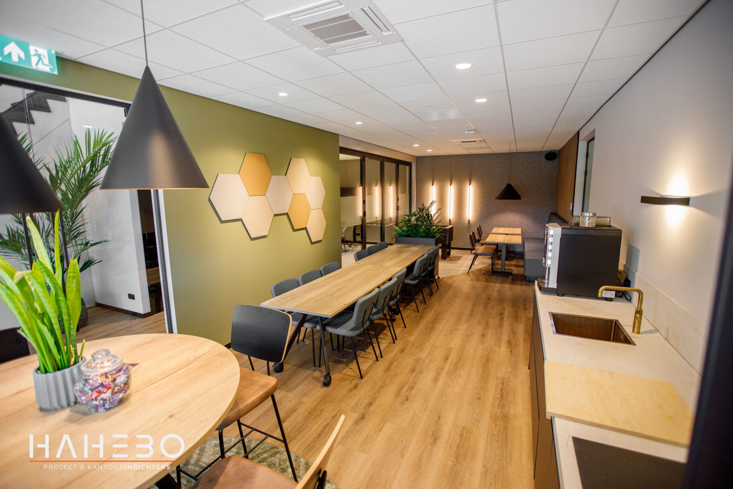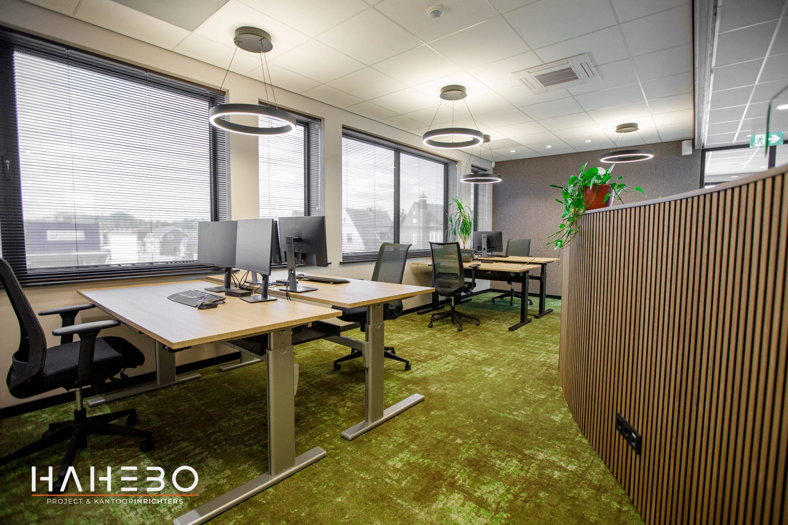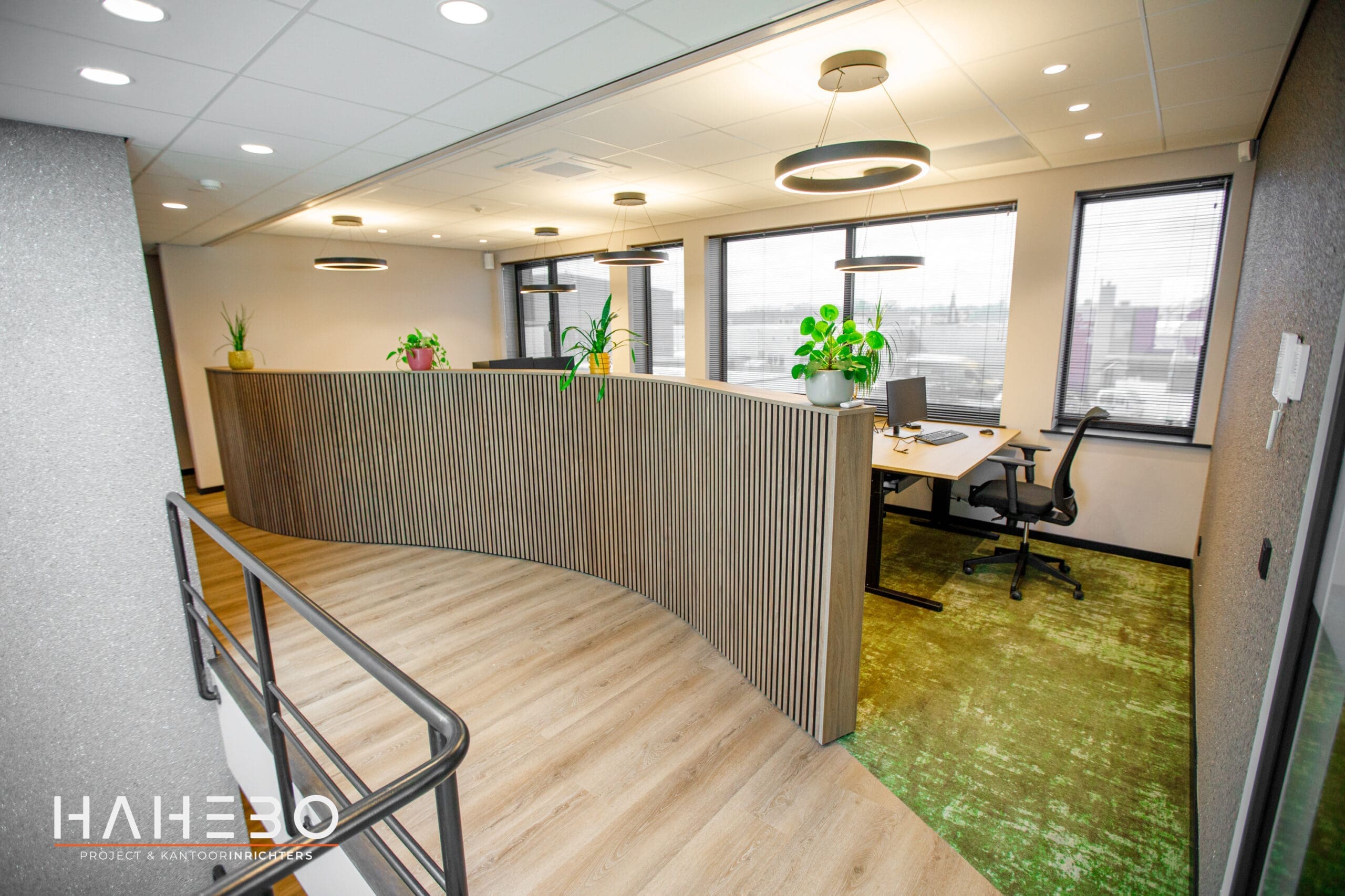 Zo kregen onder andere de bureaubladen een tweede leven door ze te wrappen, waardoor ze weer aansluiten bij de frisse en eigentijdse uitstraling van het kantoor. Door de samenwerking met lokale partijen bleven de lijnen kort en kon de verbouwing binnen de gestelde deadline worden afgerond.